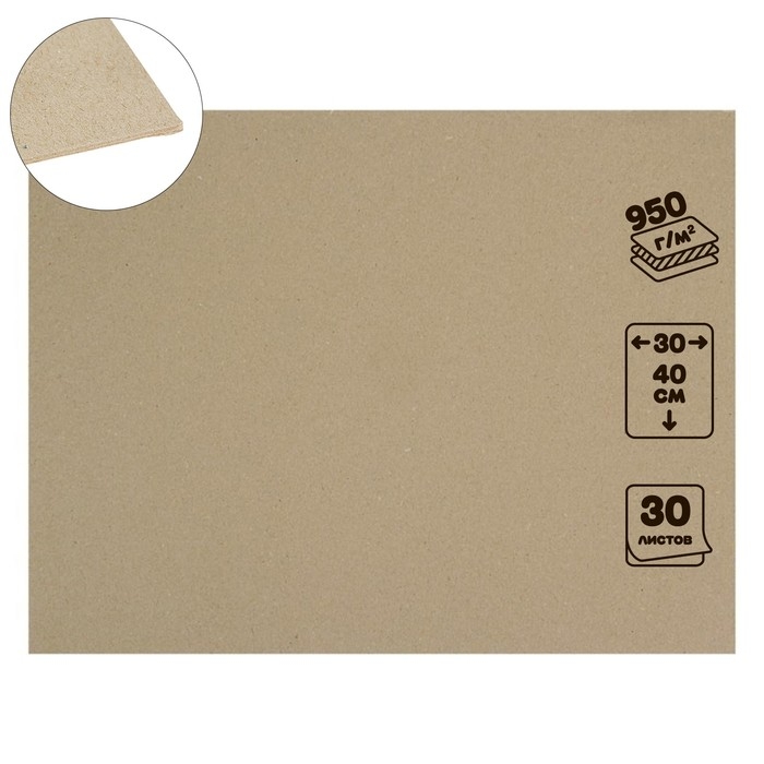 Картон переплётный 1.5 мм, 30 х 40 см, 30 листов, 950 г/м², серый
