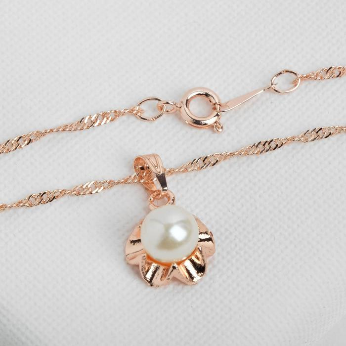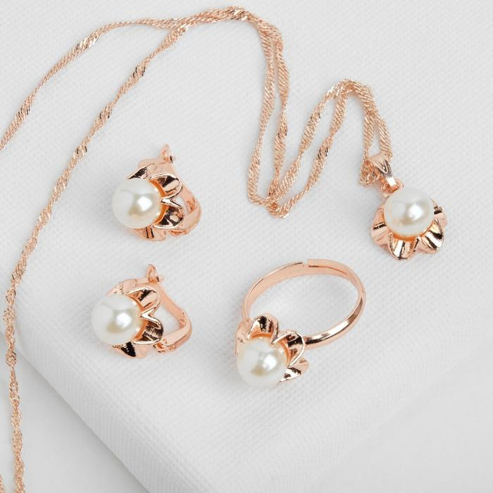 Гарнитур 3 предмета: серьги, кулон, кольцо безразмерное «Эдель» с жемчугом цветок, цвет белый в золоте, 45 см