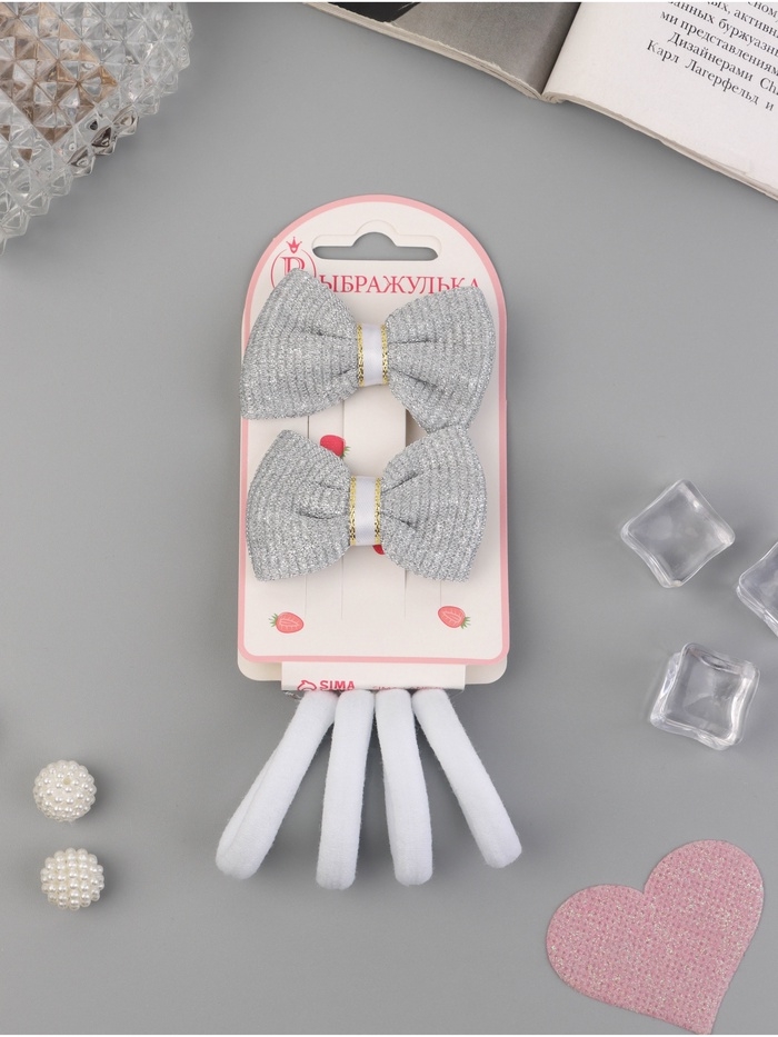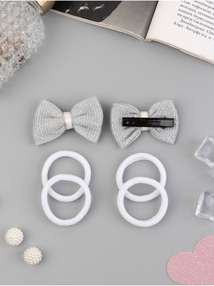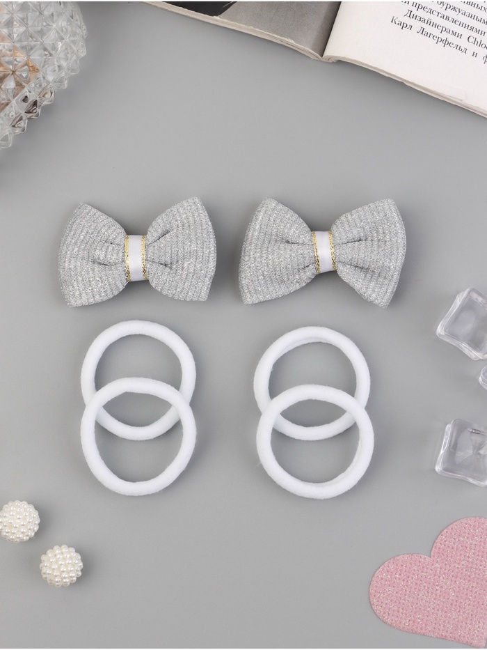 Набор для волос "Школьница галант" (4 резинки 3,5 см, 2 зажима 5,5 см) сияние, серо-белый