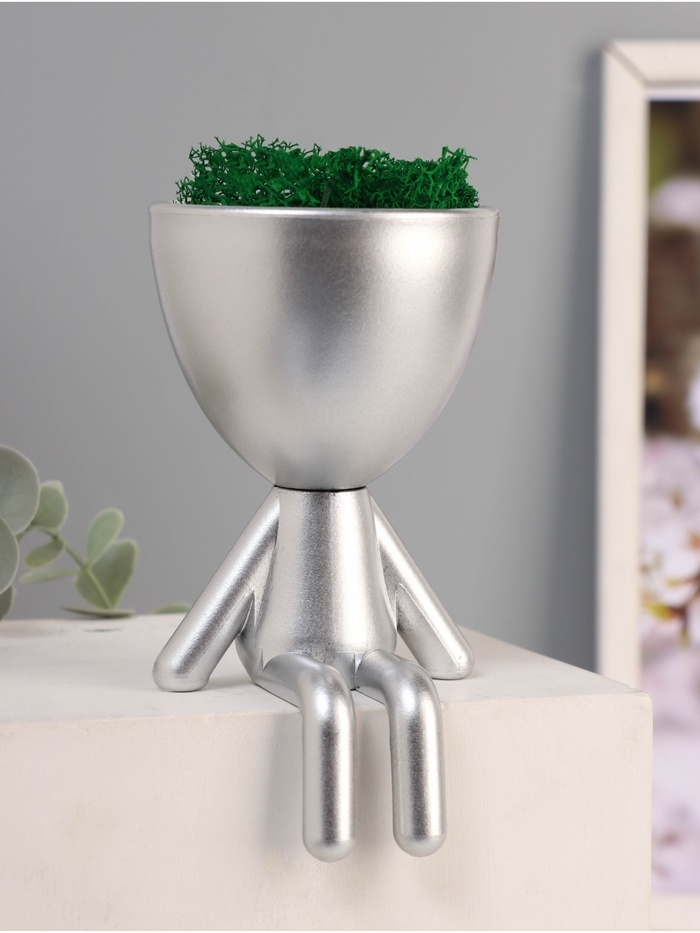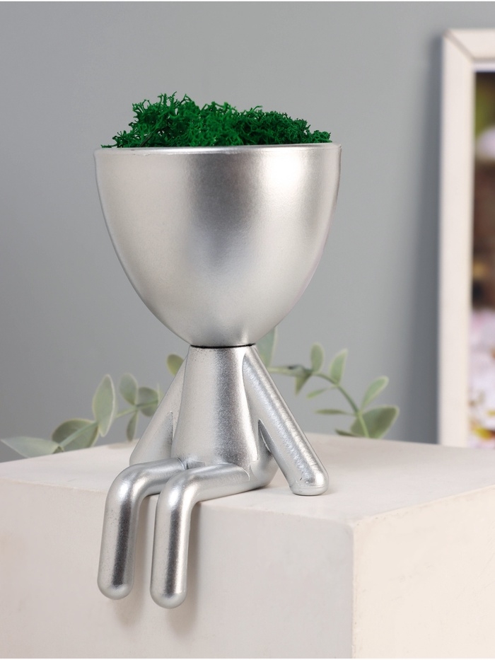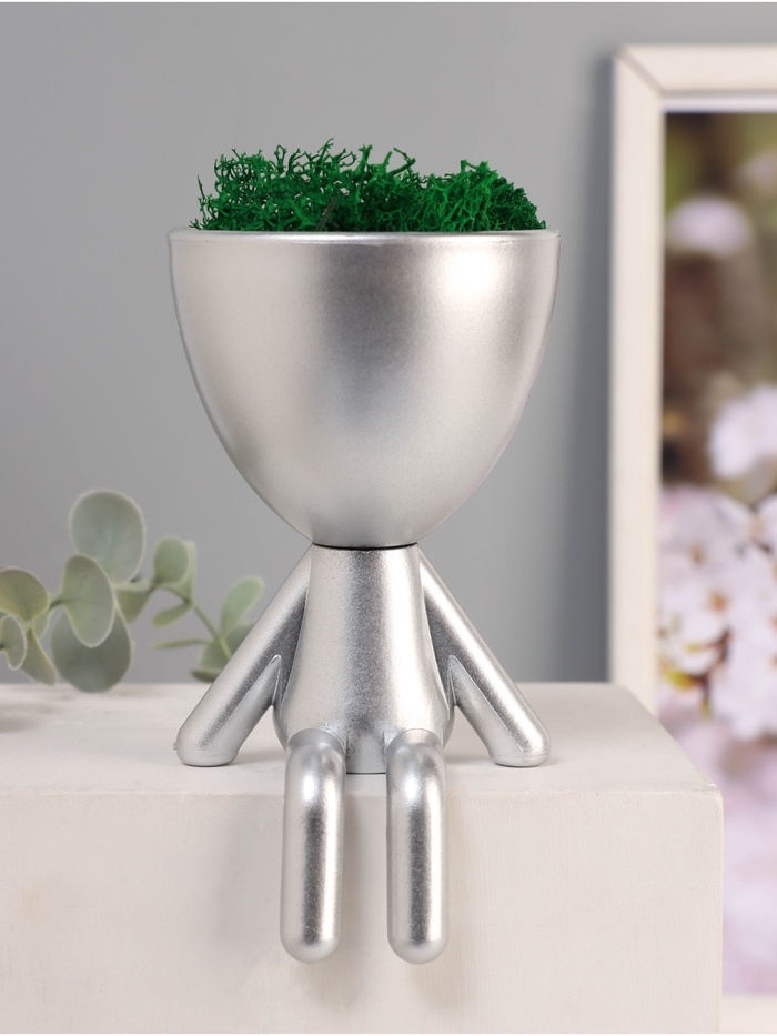 Кашпо пластиковое "Мистер Грин сидит" 13*9*7,3 см серебро