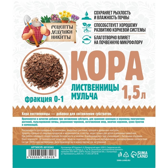 Мульча лиственницы "Рецепты Дедушки Никиты" 1,5 л фр 0-1