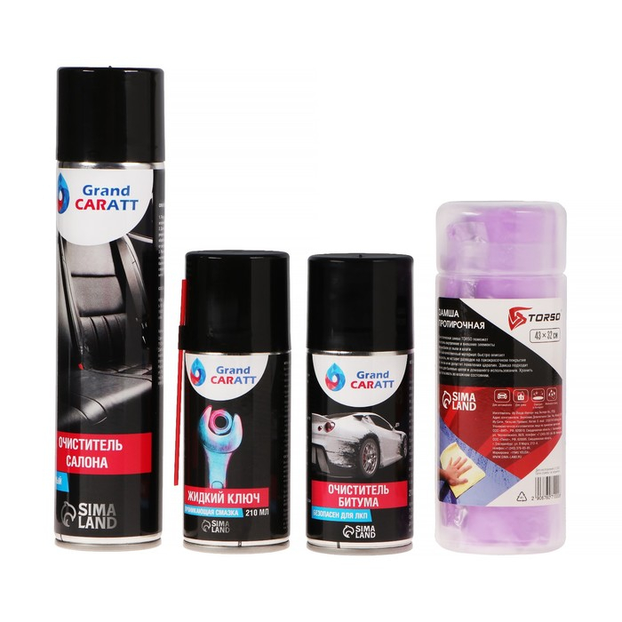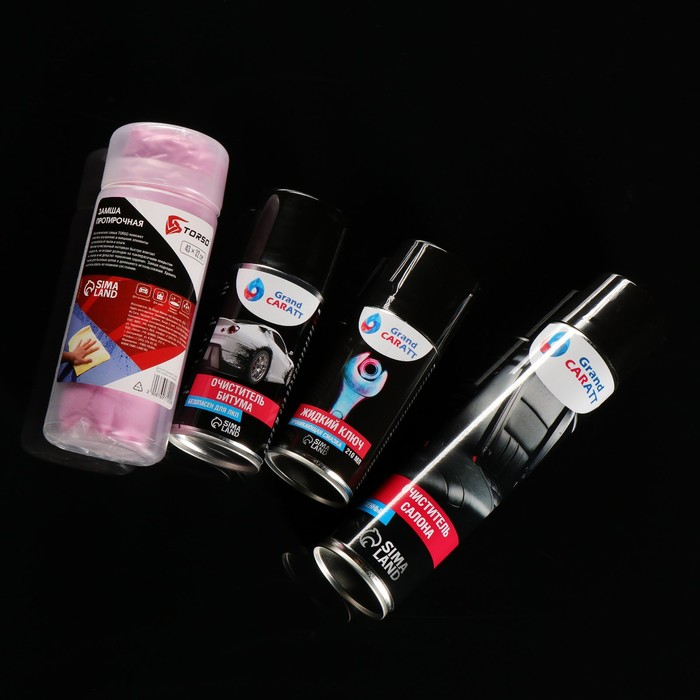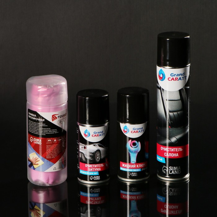 Протирочная замша идеально удаляет влагу с кузова автомобиля и стекол, не оставляя разводов. Состав очистителя битумных пятен эффективно удаляет битумные пятна, жировые, масляные и мазутные загрязнения, смолы, нефтепродукты, следы резины, чернила, граффити и остатки жевательной резинки с различных поверхностей. Жидкий ключ вытесняет влагу из механизмов и защищает от коррозии металлические детали, устраняет скрипы и снижает трение подвижных деталей, помогает открутить заржавевшие соединения. Очиститель салона, специальный состав которого легко удаляет въевшиеся загрязнения с любых видов обивки салона, велюра, кожи, кожзаменителя, ковров и других поверхностей. Очиститель устраняет неприятный запах и обладает антистатическим эффектом.