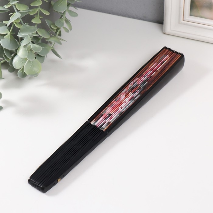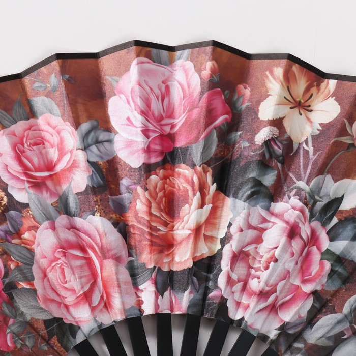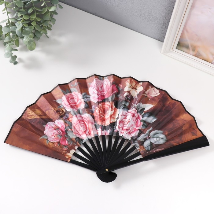 Веер пластик, текстиль h=26,5 см "Крупные розы на кофейном фоне"