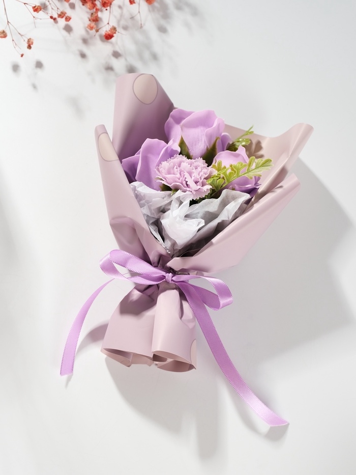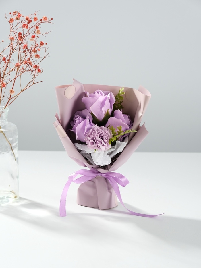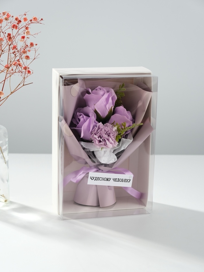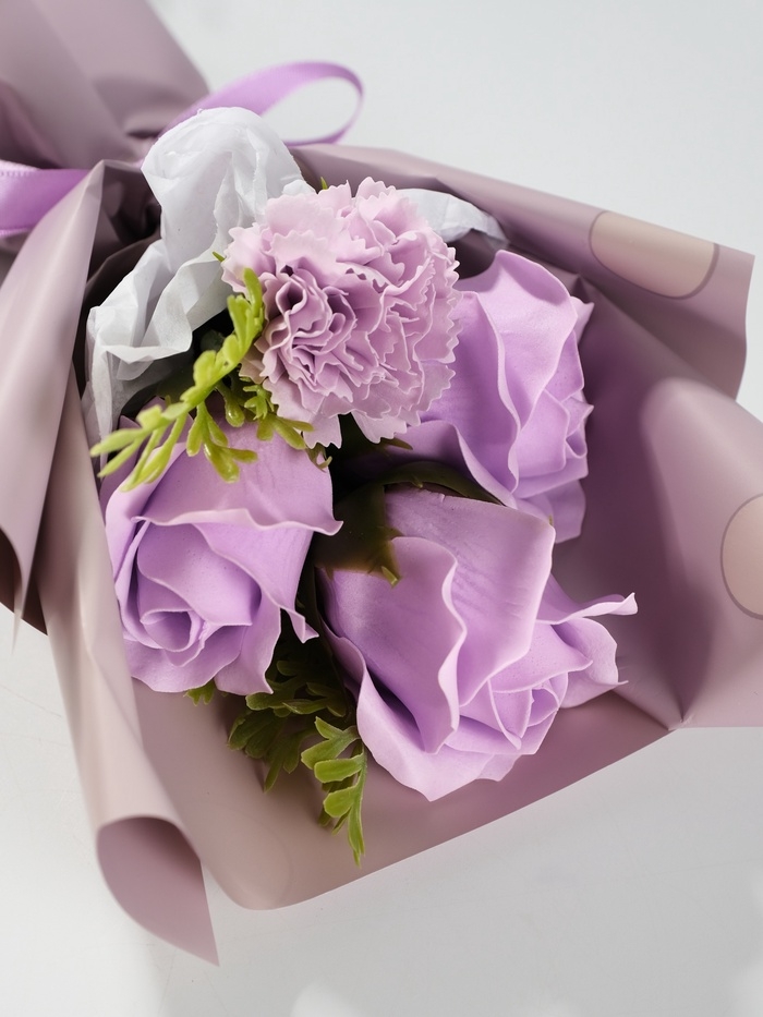 Букет из мыльных лепестков "Три розы и гвоздика" сиреневый 7,5х13,5х20 см