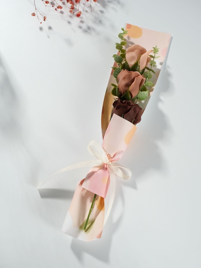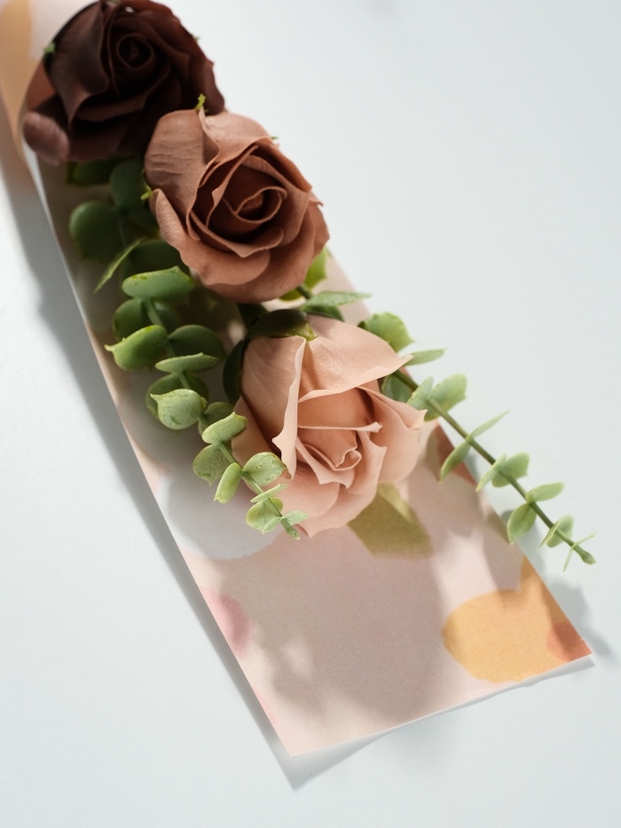 Букет из мыльных лепестков "Три розы с эвкалиптом" бежевый 8,5х7,4х38,6 см