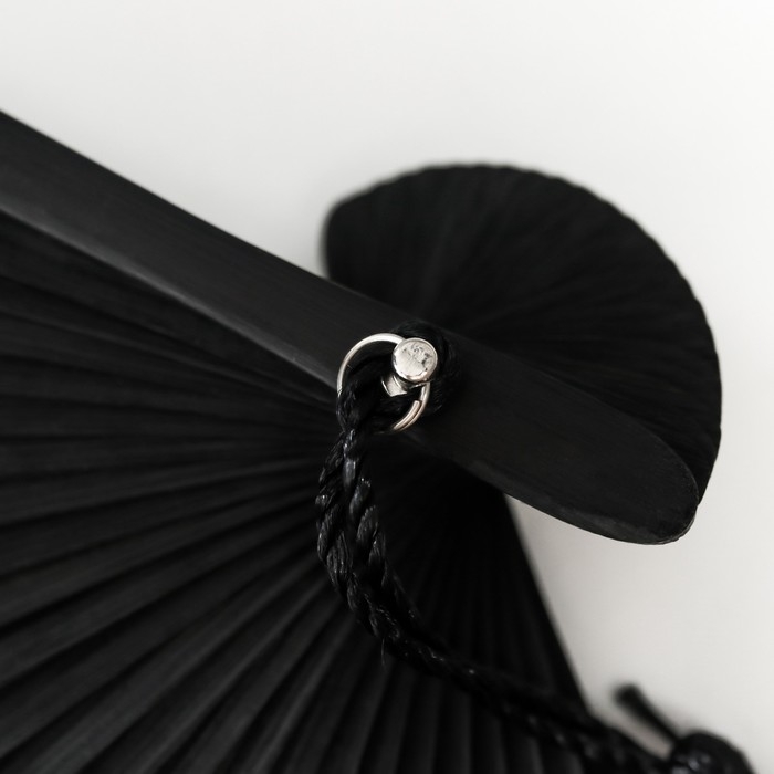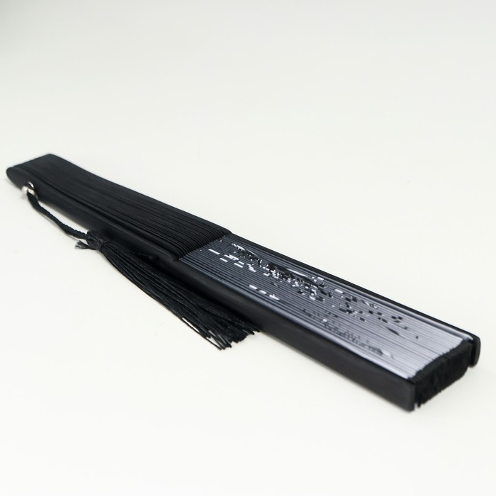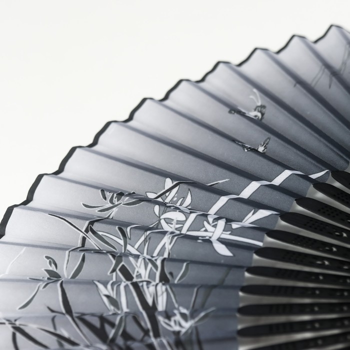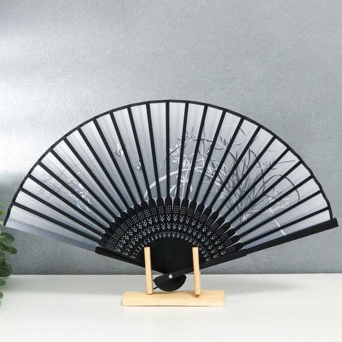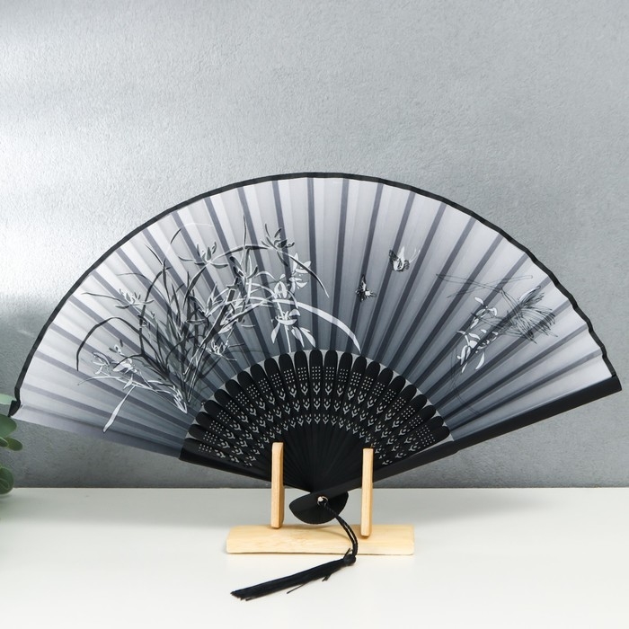 Веер бамбук, текстиль h=21 см "Бабочки в траве" чёрно-белый, с кисточкой