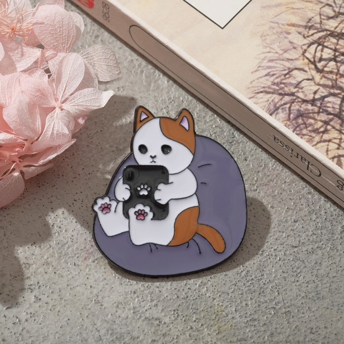 Значок «Котик» с планшетом, цветной в чёрном металле