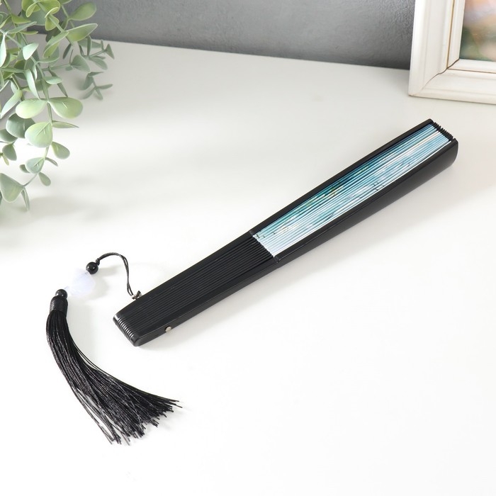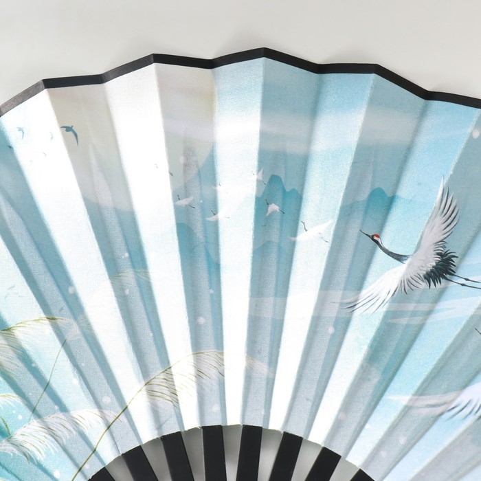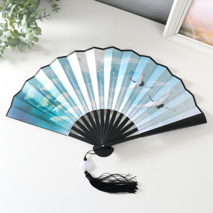 Веер пластик, текстиль h=27 см "Журавли" с кисточкой