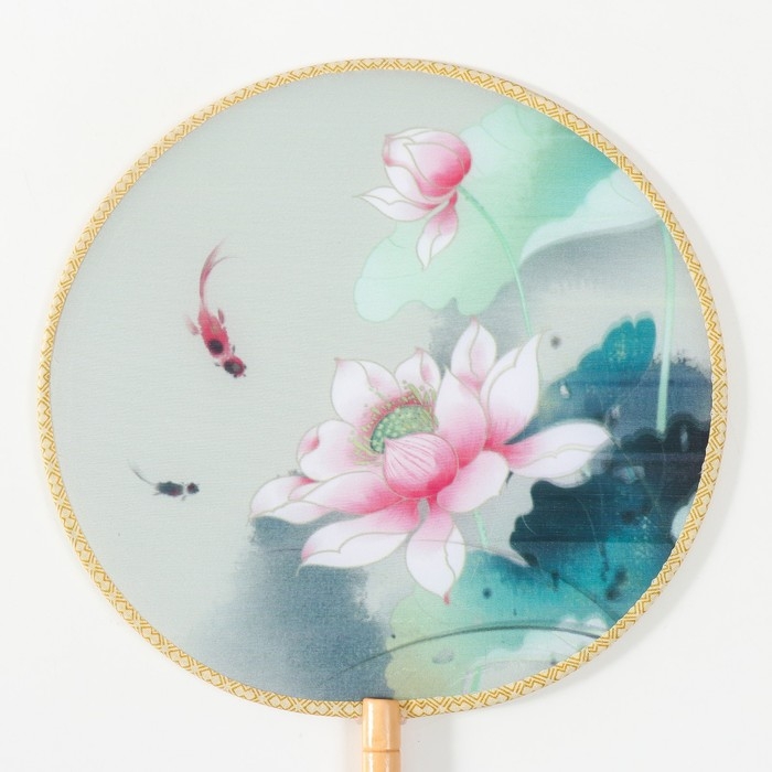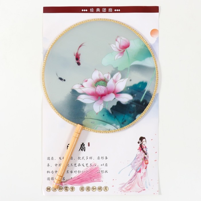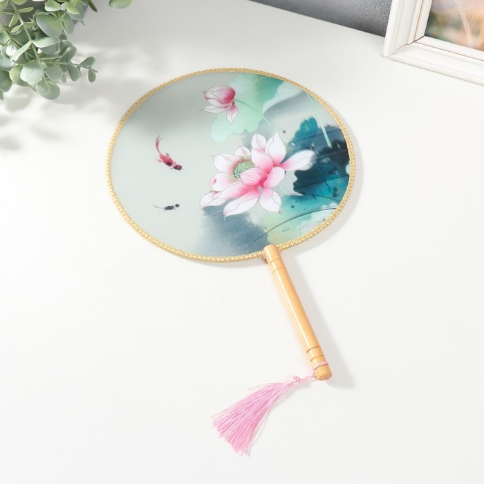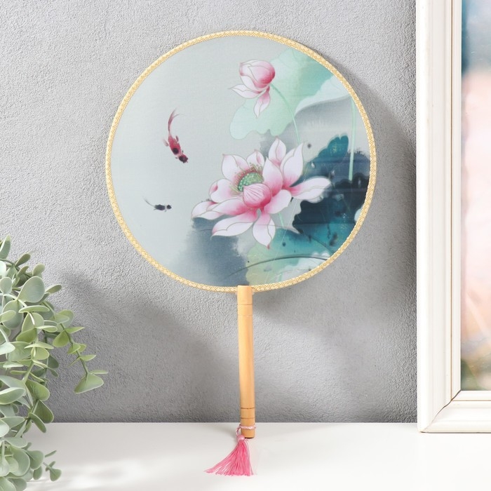 Веер круглый дерево, текстиль "Лотос" с кисточкой 33х21,5 см
