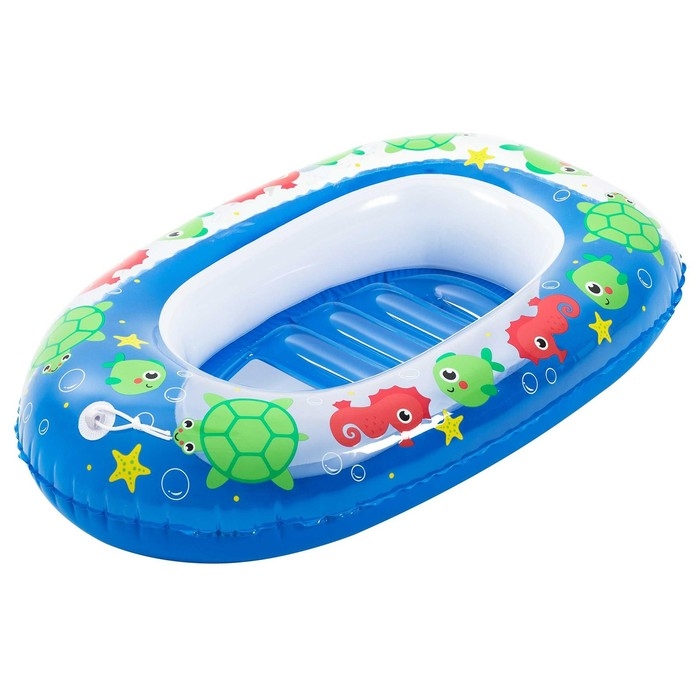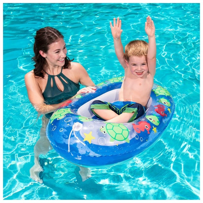 Надувная лодочка — это удобный и оригинальный плот для плавания и игр на воде. Отдых на природе станет для вашего малыша увлекательным приключением. Сквозь прозрачное окошко ребёнок сможет наблюдать за подводным миром. Большие бортики и мягкое дно гарантируют удобную посадку. В передней части установлено кольцо с тросиком, за который кроха сможет держаться сам. Прикрепите лодочку к гидроциклу и покатайте малыша.