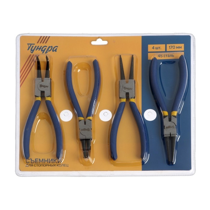 Набор съёмников стопорных колец ТУНДРА используется в мастерских и автосервисах во время демонтажных работ. Губки съёмников изготовлены из высокопрочного металла, что гарантирует надёжность при интенсивной эксплуатации.