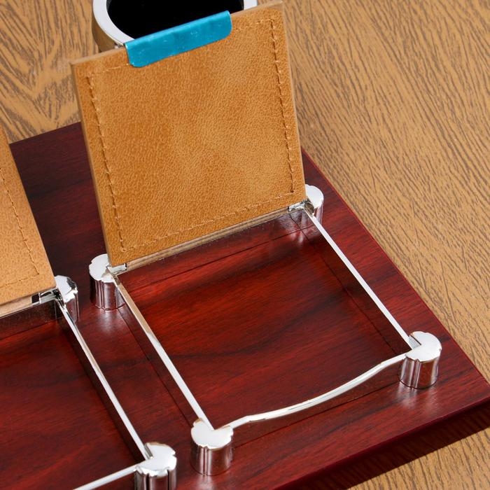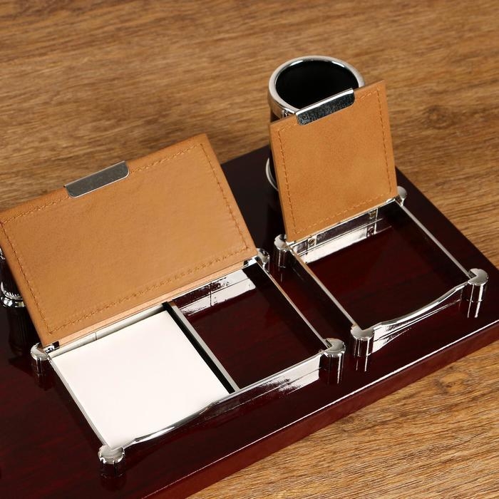 Компактный настольный набор поможет избежать хаоса на рабочем месте. Храните в нём канцелярские принадлежности или другие мелочи, чтобы правильно организовать пространство. К тому же изделие имеет минималистичный дизайн и выполнено под дерево, поэтому оно украсит собой любое место как декоративный элемент.