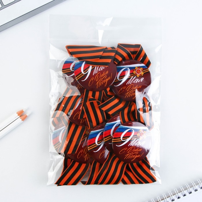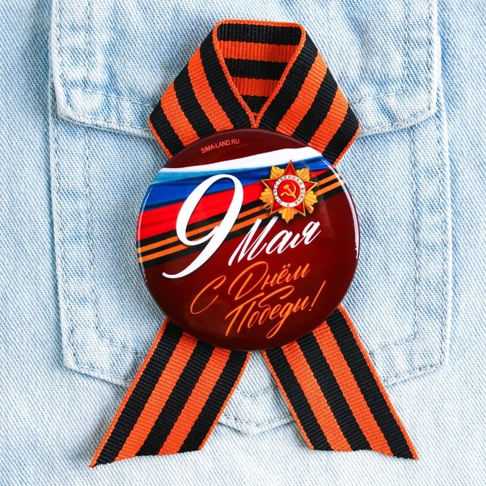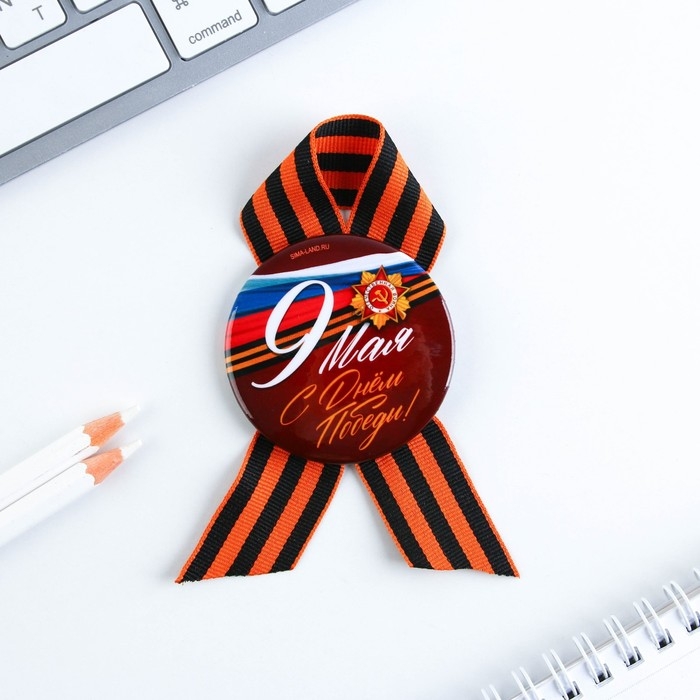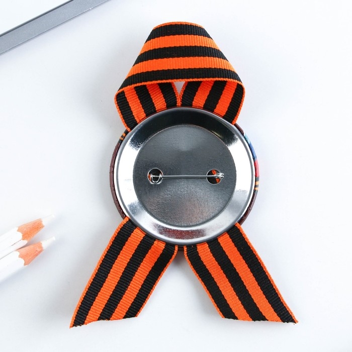 Георгиевская лента - главный атрибут и символ Дня Великой Победы. Ленточка дополнена металлическим значком-орденом с эксклюзивным дизайном. Изделие крепится с помощью булавки. Диаметр значка составляет 5,6 см.