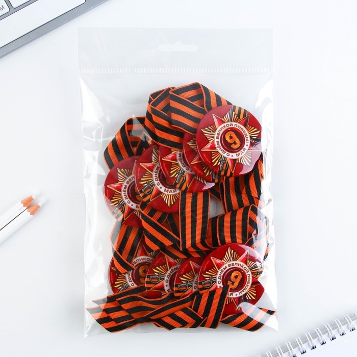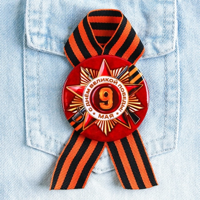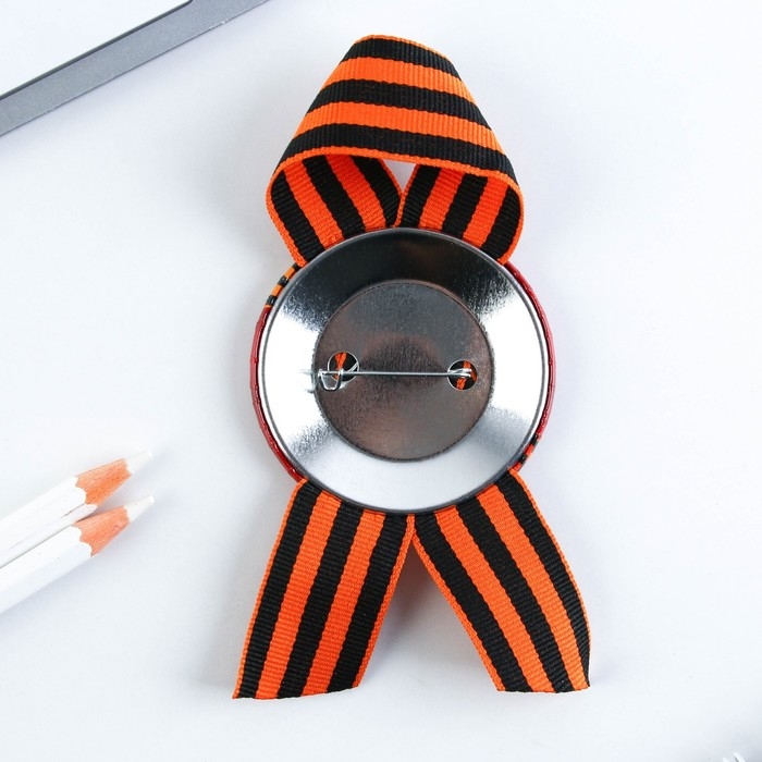 Георгиевская лента - главный атрибут и символ Дня Великой Победы. Ленточка дополнена металлическим значком-орденом с эксклюзивным дизайном. Изделие крепится с помощью булавки. Диаметр значка составляет 5,6 см.
