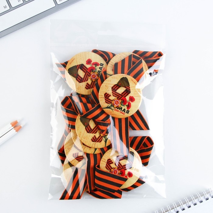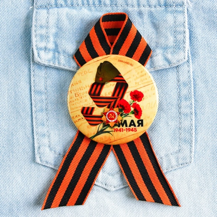 Георгиевская лента - главный атрибут и символ Дня Великой Победы. Ленточка дополнена металлическим значком-орденом с эксклюзивным дизайном. Изделие крепится с помощью булавки. Диаметр значка составляет 5,6 см.