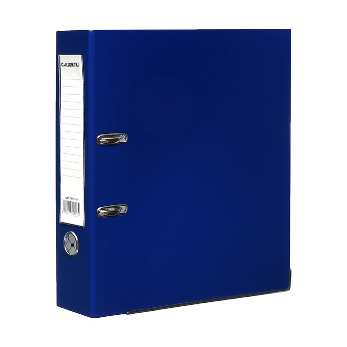 Папка–регистратор Calligrata серии Mega размером А4 (320 х 290 х 75 мм) с обложкой из жесткого износостойкого картона с односторонним покрытием из бумвинила. Вместимость папки – 550 листов, ширина корешка – 75 мм. Цвет – синяя. Конструкция разработана с учетом всех особенностей эксплуатации. Папка выгодно отличается надежным арочным механизмом из качественного металла, наличием кармана на корешке со сменным информационным ярлыком для маркировки, полем для записей на внутренней стороне обложки и отверстием для удобного снятия с полки.