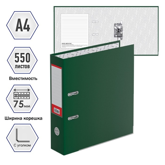 Папка–регистратор Calligrata серии Mega размером А4 (320 х 290 х 75 мм) с обложкой из жесткого износостойкого картона с односторонним покрытием из бумвинила. Вместимость папки – 550 листов, ширина корешка – 75 мм. Цвет – зеленый. Конструкция разработана с учетом всех особенностей эксплуатации. Папка выгодно отличается надежным арочным механизмом из качественного металла, наличием кармана на корешке со сменным информационным ярлыком для маркировки, полем для записей на внутренней стороне обложки и отверстием для удобного снятия с полки.