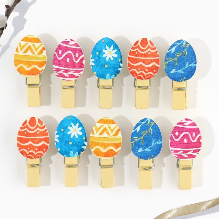 - это декоративный элемент, который станет незаменимым помощником в подготовке к празднику Пасхи. Изготовленные из дерева, прищепки отличаются своей прочностью и долговечностью. - Разноцветный дизайн декора на прищепках делает их яркими и привлекательными, что позволяет создать праздничное настроение и атмосферу. - В комплекте идет 10 прищепок, что позволяет украсить большое количество верб. - Вес набора составляет всего 20 грамм, что делает его легким и удобным для использования. - Набор прищепок для украшения вербы «ХВ» станет отличным выбором для тех, кто хочет создать праздничное настроение и украсить свой дом к Пасхе.