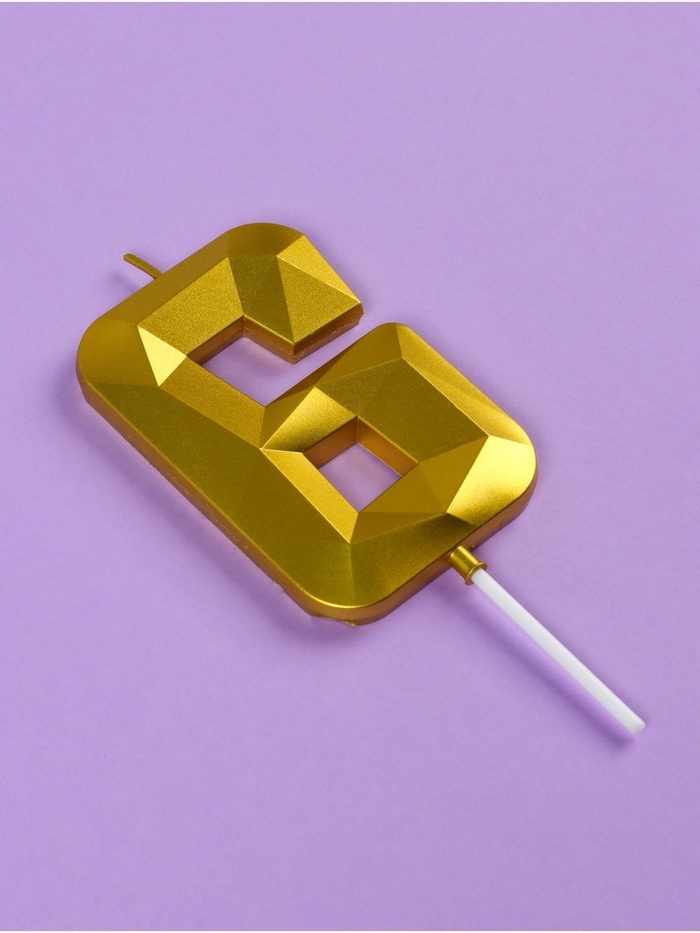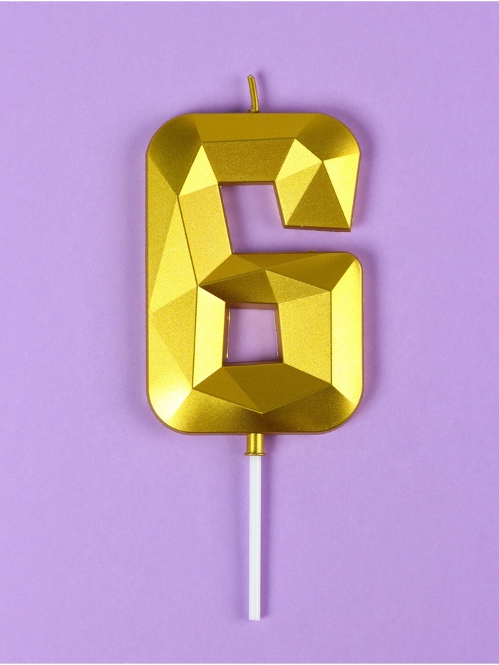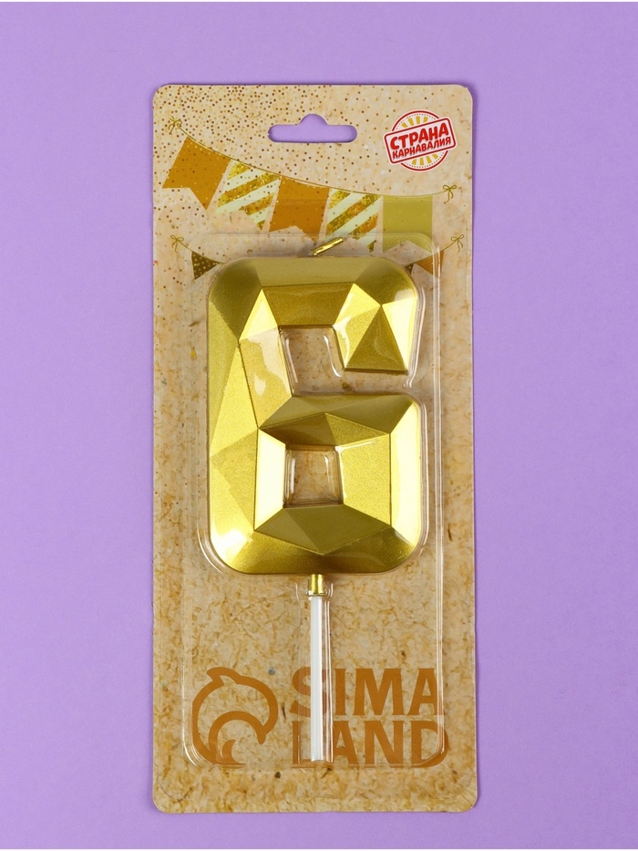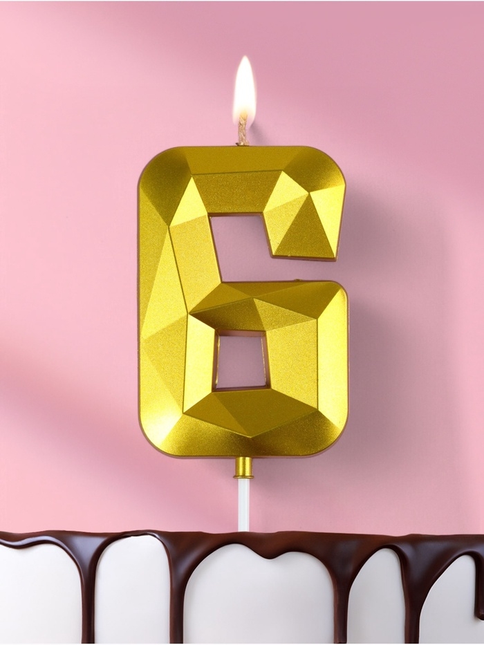 Свеча ГИГАНТ в торт на шпажке «Грань», цифра "6", золотая, 9 см