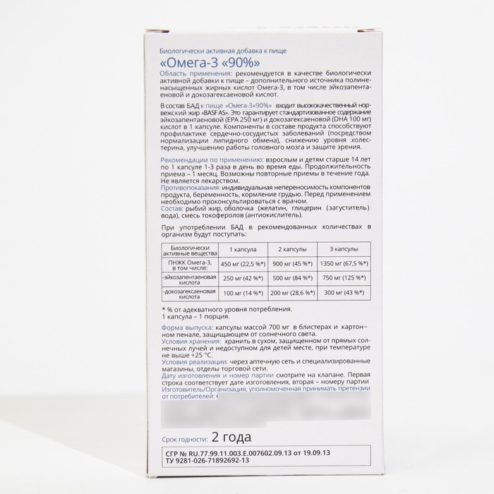 Биологически активная добавка Омега-3 90% содержит стандартизованное количество эйкозапентаеновой (EPA 250 мг) и докозагексаеновой кислот (DHA 100 мг) в 1 капсуле. В производстве используется высококачественный исландский жир LYSI, прошедший процесс дополнительной концентрации Омега-3 кислот до 90%. Несколько этапов очистки сырья гарантирует отсутствие пестицидов и холестерина. Продукт обладает нейтральным запахом и не имеет привкуса.