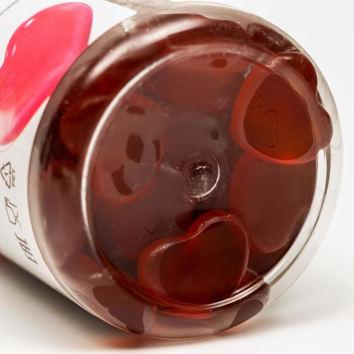 Состав: солодовый сироп, сахар, коллагена гидролизат (рыбный), желатин, крахмал, сорбитол (подсластитель), лимонная кислота (Е330, регулятор кислотности), аскорбиновая кислота (витамин С), натуральный клубничный ароматизатор, яблочная кислота (Е296, консервант), дрожжи, обогащенные селеном, растительное масло (содержит карнаубский воск), концентрат сока черной моркови, натрия цитрат (Е331, стабилизатор), биотин.