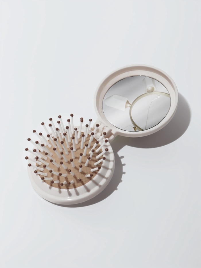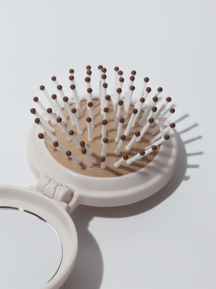 Расчёска отличается прочностью и эргономичностью. Её круглая форма обеспечивает удобство хранения, а рисунок на поверхности добавляет особого шарма. Складной механизм позволяет легко поместить её в косметичку или карман, не занимая много места.