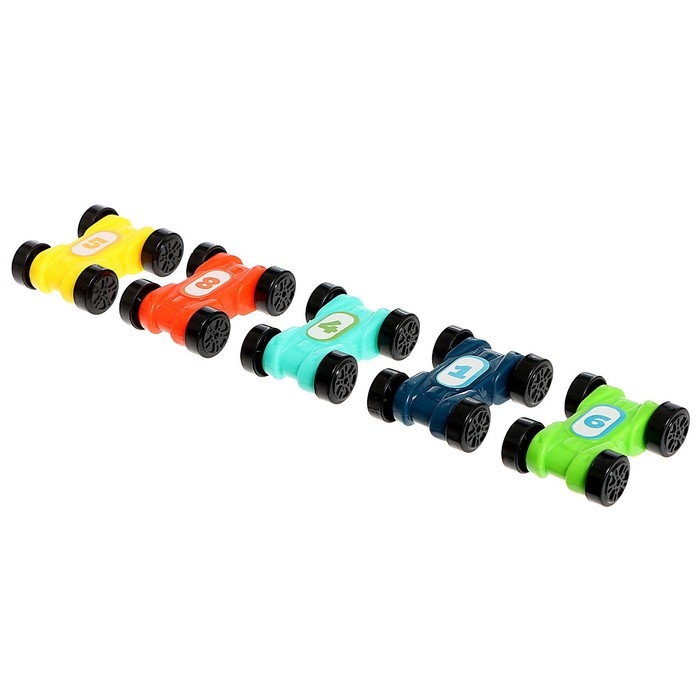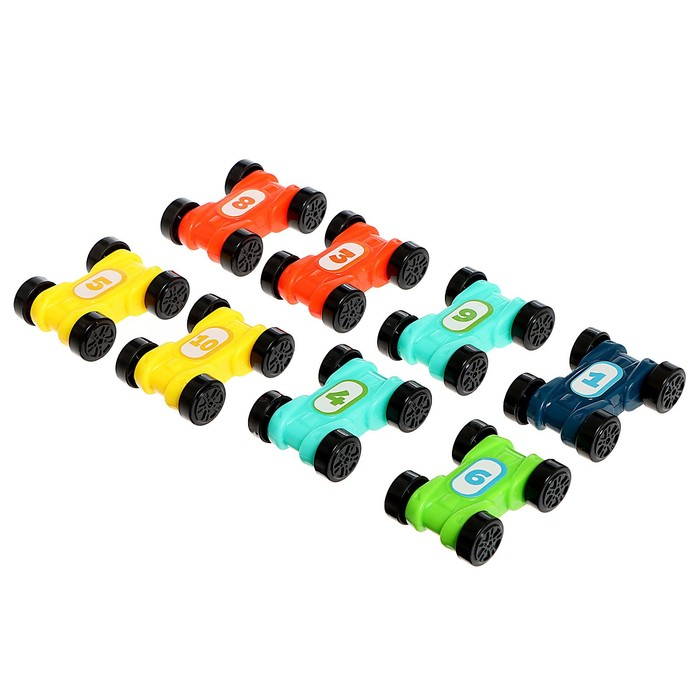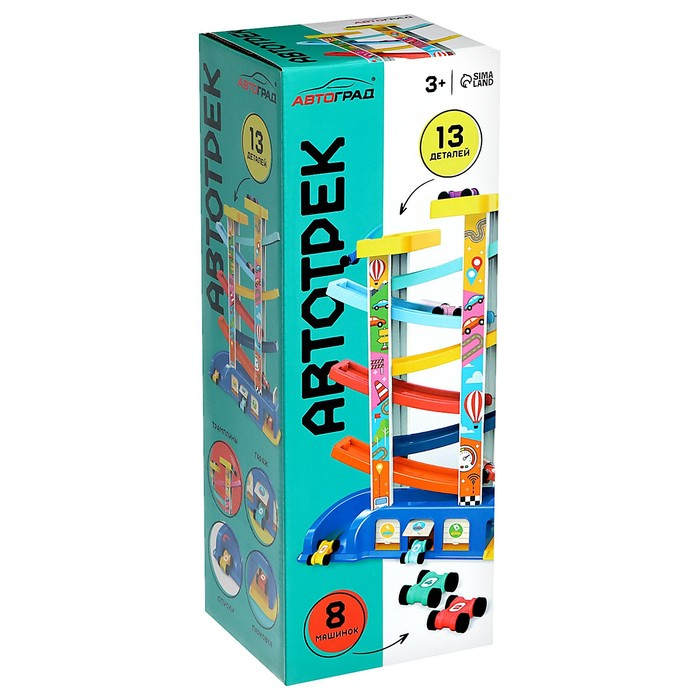 - В комплекте 8 машинок, которые ребёнок будет с пускать по горкам и завозить по гаражам. Малыш придумает множество интересных историй и сюжетов про гонки и автомобили.