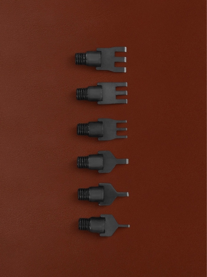 Создавайте уникальные элементы для кожаных изделий с помощью набора, который объединяет семь инструментов для профессиональной обработки материала. Этот комплект включает шесть сменных насадок и одну основу, что делает его универсальным решением для мастеров всех уровней.