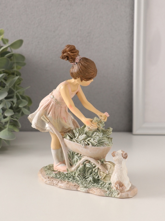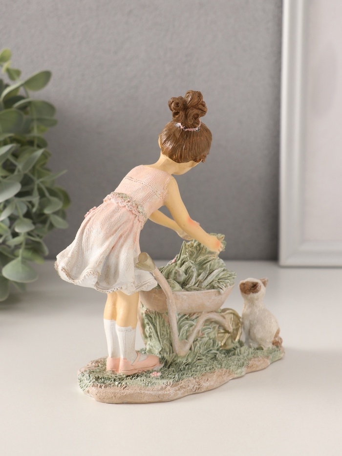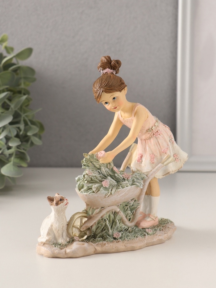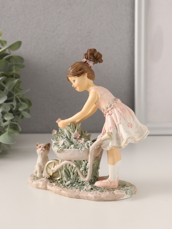 Сувенир полистоун "Девочка с цветами в тачке, с котёнком" розовый 14х6,5х15 см