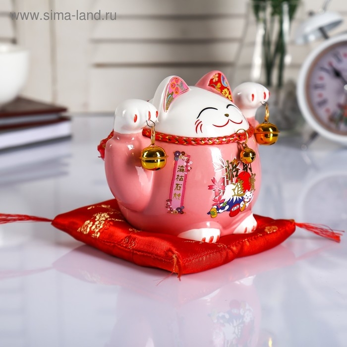 Копилка керамика "Кот манэки-нэко розовый с колокольчиками" 10,5х13,5х9 см
