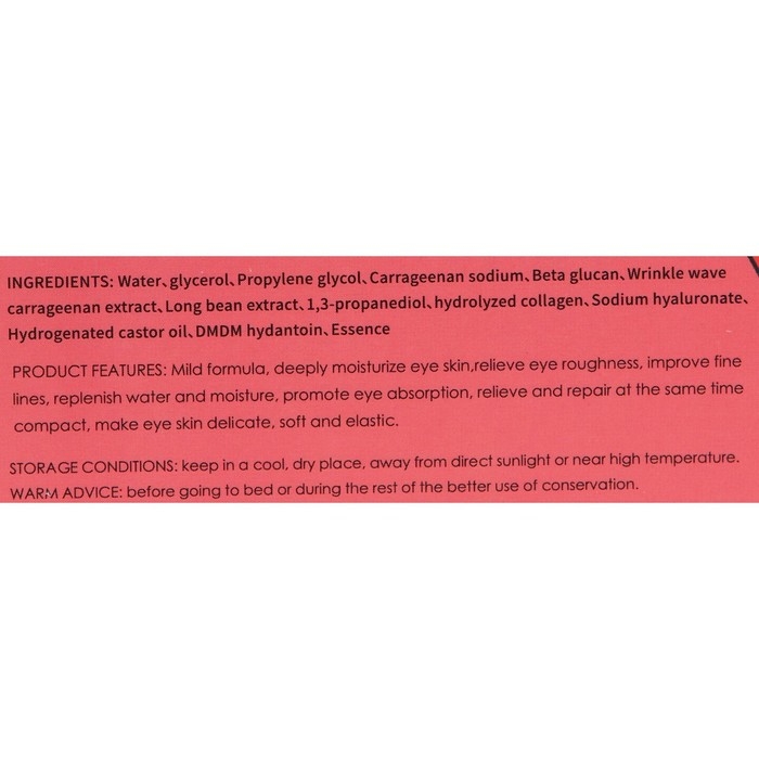 Состав: water, glycerol, propylene glycol, carrageenan sodium, beta glucan, wrinkle wave carrageenan extract, long bean extract, 1,3-propanediol, hydrolyzed collagen, sodium hyaluronate, hydrogenated castor oil, DMDM hydantoin, essence.