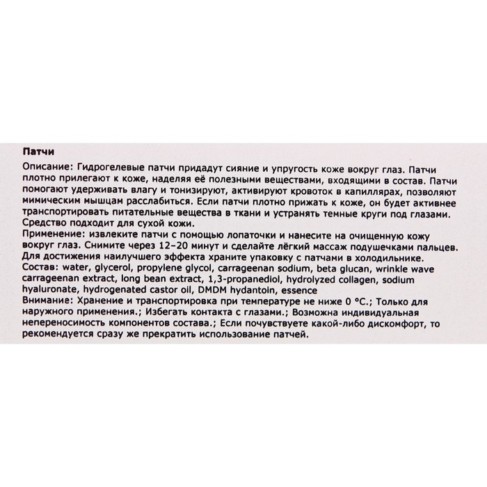 Гидрогелевые патчи придадут сияние и упругость коже вокруг глаз. Патчи плотно прилегают к коже, наделяя её полезными веществами, входящими в состав. Они помогают удерживать влагу и тонизируют, активируют кровоток в капиллярах, позволяют мимическим мышцам расслабиться. Если патчи плотно прижать к коже, они будут активнее транспортировать питательные вещества в ткани и устранять темные круги под глазами. Средство подходит для сухой кожи.