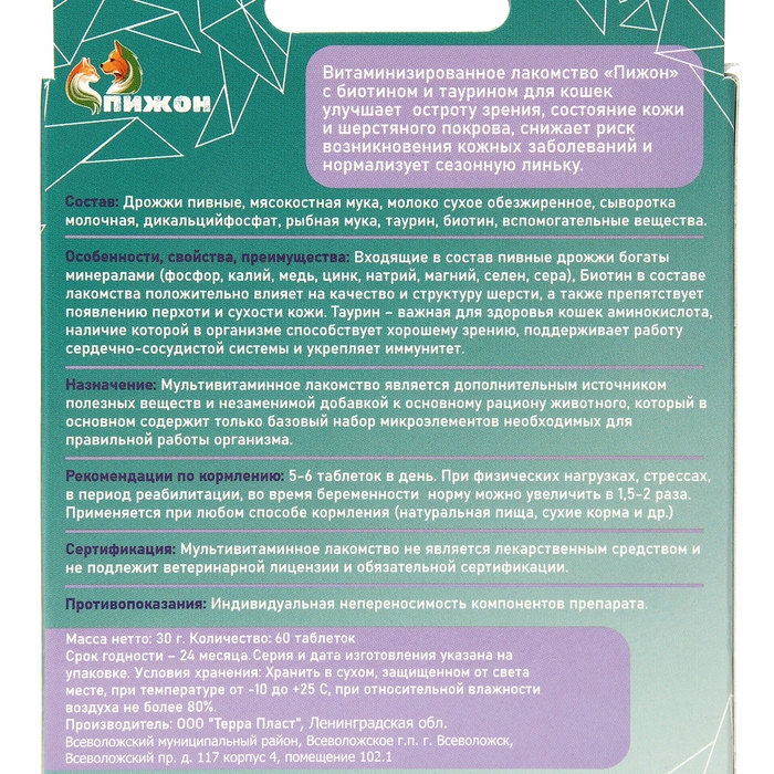 Лакомство для кошек "Пижон" против линьки, мультивитаминное, 60 таб