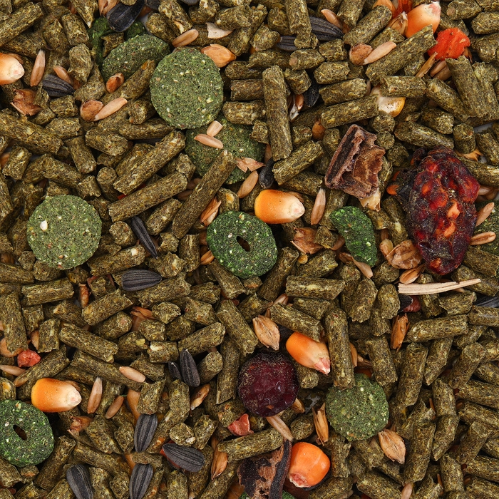 Состав: Травяные гранулы, кукуруза, ячмень воздушный, подсолнечник черный, гранулы экструдированные, морковь сушеная, овсянка, гранулы экструдированные колечки, плоды шиповника, плоды рожкового дерева.