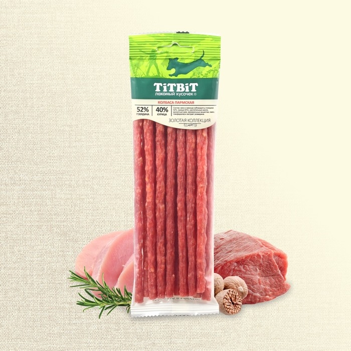 Золотая коллекция – это линейка лучших лакомств TITBIT, разработанных при участии владельцев домашних животных и их питомцев. Колбаса «Пармская» приготовлена из говядины и филе курицы и дополнена щепоткой мускатного ореха, придающего изысканность нежному вкусу.