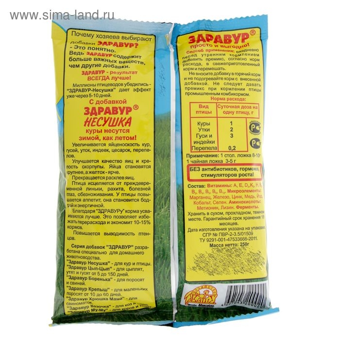 Кроме того, «Здравур Несушка» помогает сэкономить корма! Специальные кормовые ферменты, содержащиеся в ней, повышают усвоение организмом питательных веществ из корма. Благодаря этому ни один грамм кормов не тратится зря! «Здравур Несушка» очень выгодна в применении: курице в день требуется всего 1 г добавки, а прибавка яиц составит до 5–6 штук в неделю.