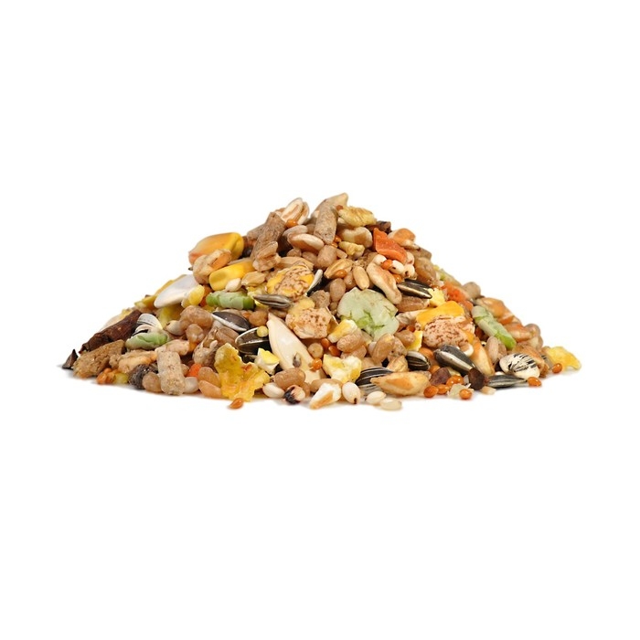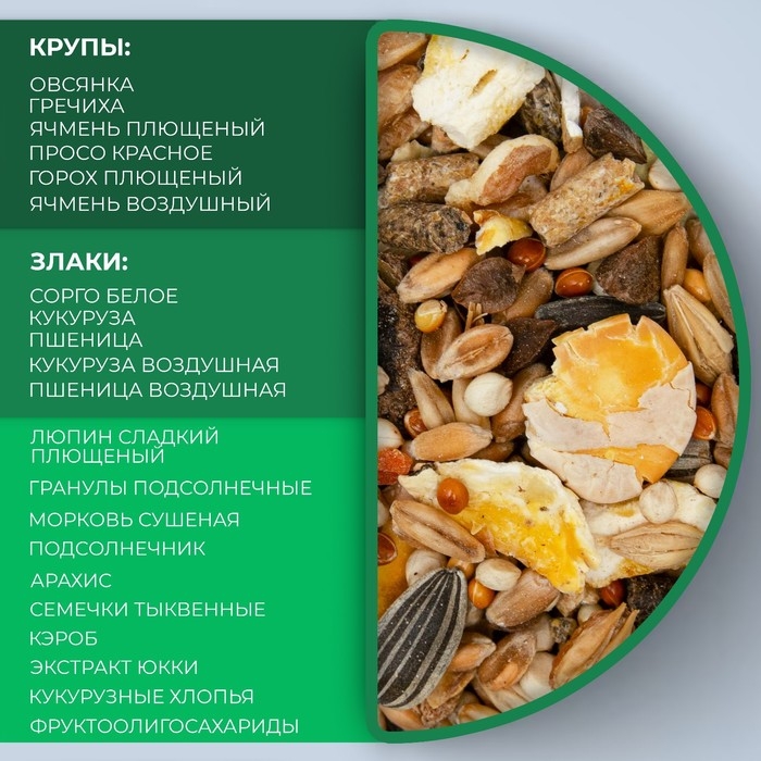 Состав: Пшеница, просо красное, сорго белое, ячмень, гранулы мультизерновые, овсянка, семена подсолнечника, ячмень плющевый, хлопья кукурузные, гречиха, плоды рожкового дерева (кэроб), горох плющеный, пшеница воздушная, кукуруза воздушная, ячмень воздушный, арахис, кукуруза, люпин сладкий плющеный, морковь сушеная, семечки тыквенные, фруктоолигосахариды, экстракт юкки.