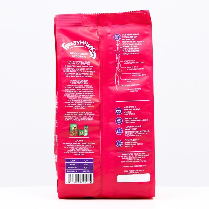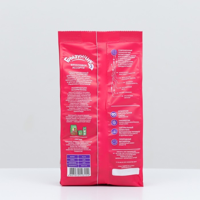 Гранулированный корм-лакомство для хомяков, морских свинок, мышей, крыс и других декоративных мелких грызунов. Этот корм подойдет также для кроликов, шиншилл и белок. Содержит вещество, необходимое для нормального развития и жизнедеятельности Вашего зверька.