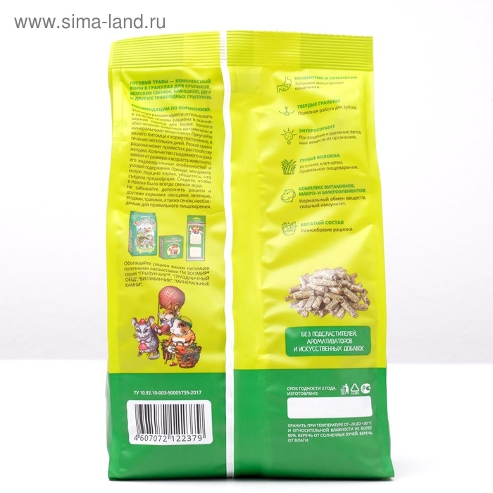 Состав: Люцерна, клевер, одуванчик, крапива и другие луговые травы, семена злаковых растений, мелисса, витаминно-минеральный комплекс, пробиотик, пребиотик и энтеросорбент.