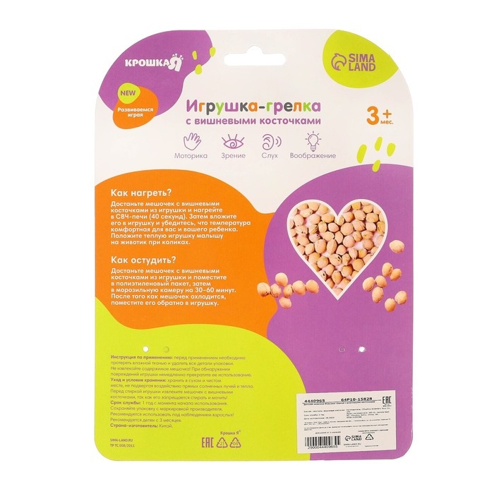 Согревает. Как нагреть? Достаньте подушечку с вишневыми косточками из игрушки и нагрейте в СВЧ печи 40 секунд. Затем вложите подушечку в игрушку и убедитесь, что температура комфортная для вас и вашего ребёнка. Положите теплую игрушку малышу на животик при коликах.