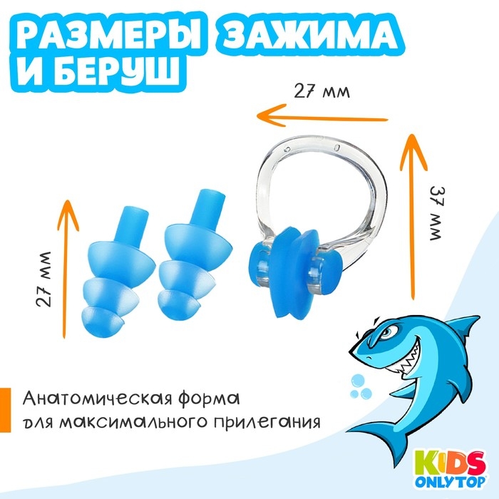 Набор для плавания ONLYTOP «Акула»: зажим для носа, беруши, цвет синий