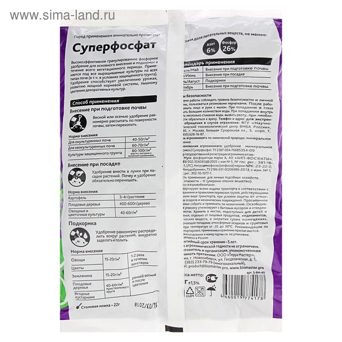 Удобрение минеральное БиоМастер Суперфосфат хорошо повлияет на развитие ваших растений. Благодаря такой помощи любой кустарник, корнеплод или цветок будет сильным, здоровым, а урожай – великолепным.