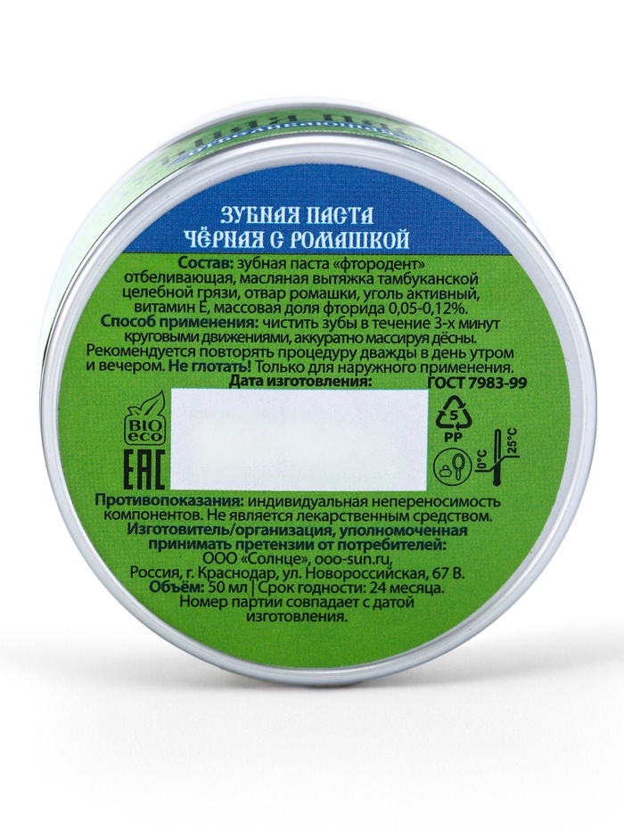 Паста зубная черная с Ромашкой, "Святая рука", 50 мл