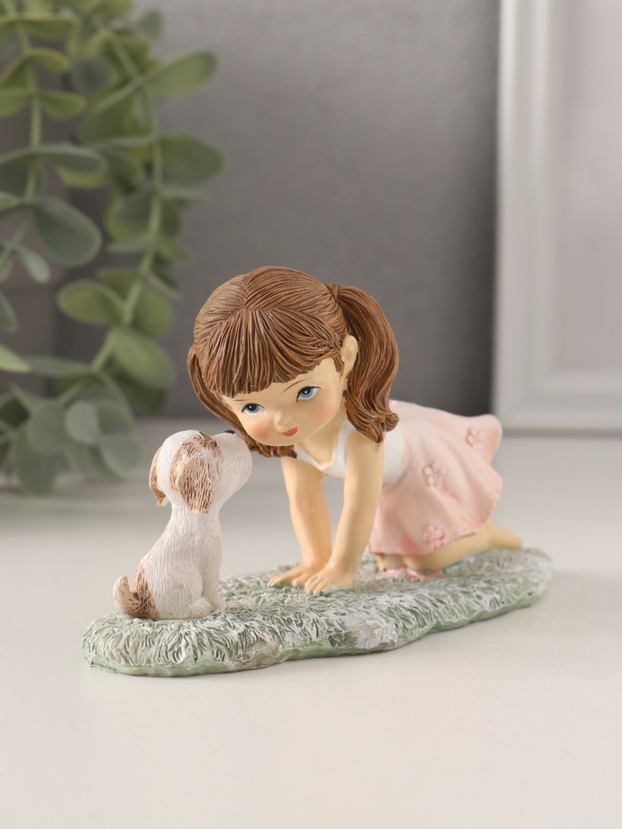 Сувенир полистоун "Малышка играет с щеночком на лужайке" розовый 12х5х7,5 см