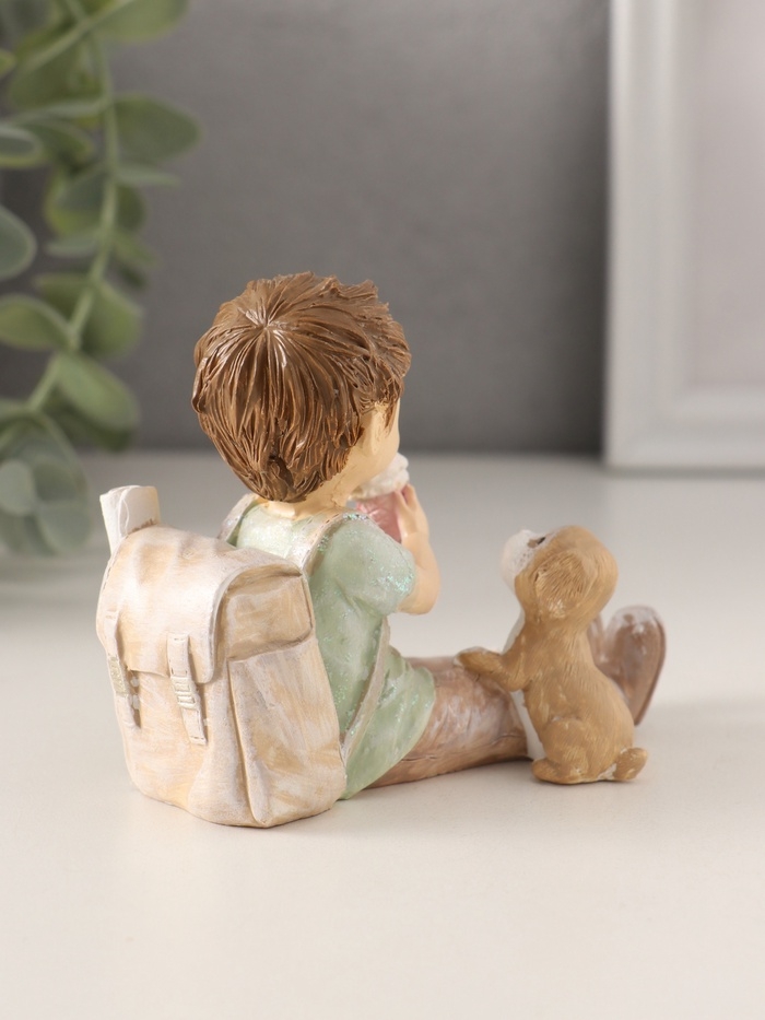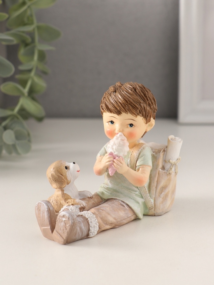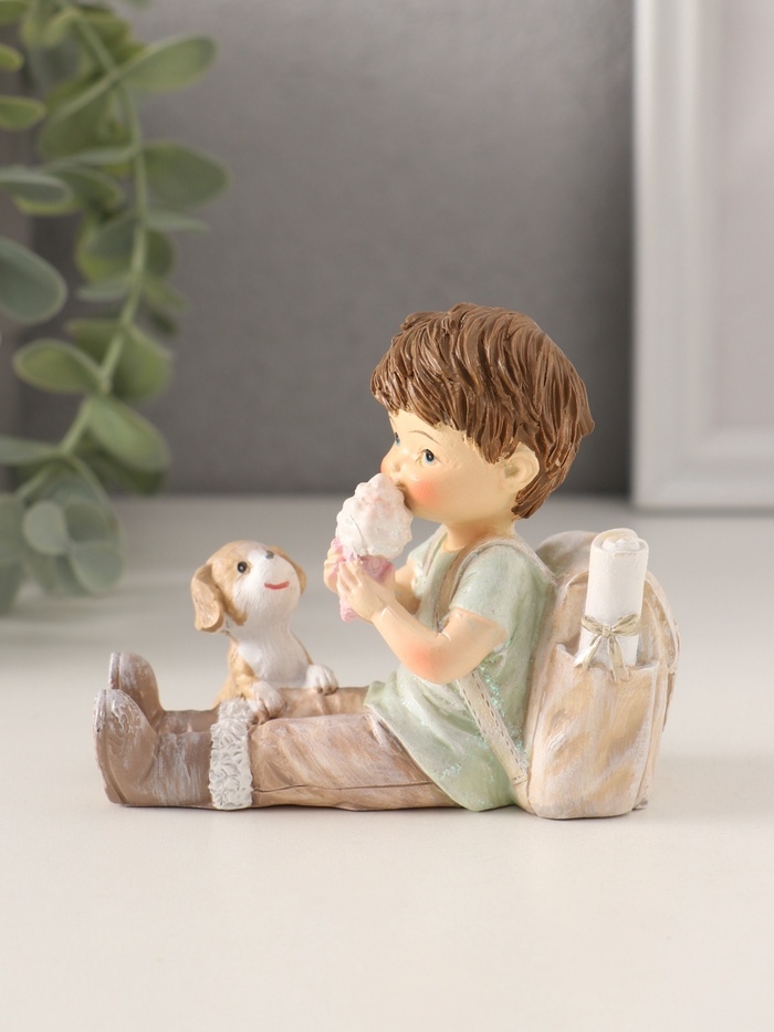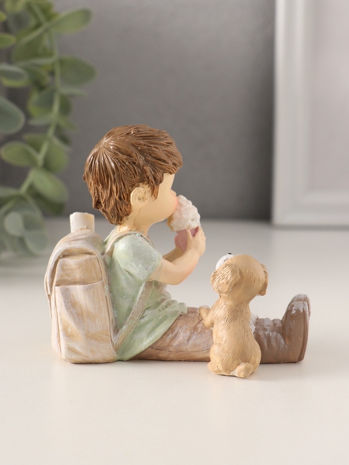 Сувенир полистоун "Мальчишка с рюкзаком и щенком, ест мороженое" 9,5х5х8,5 см