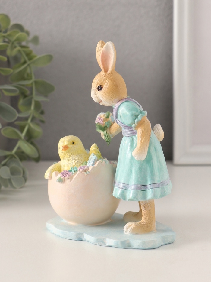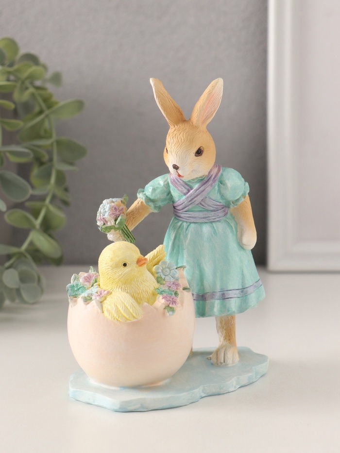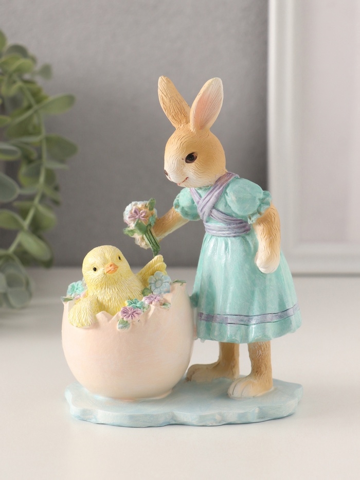 Сувенир полистоун "Зайка в голубом платье и цыплёнок в яйце с незабудками" 10х6,5х13,5 см