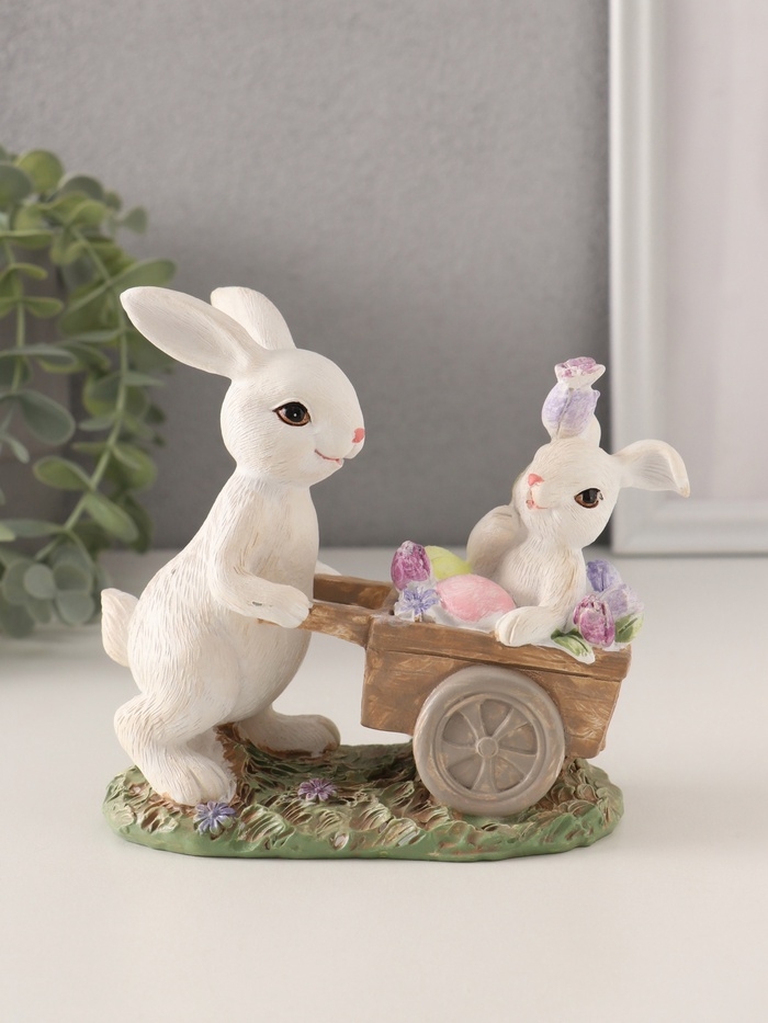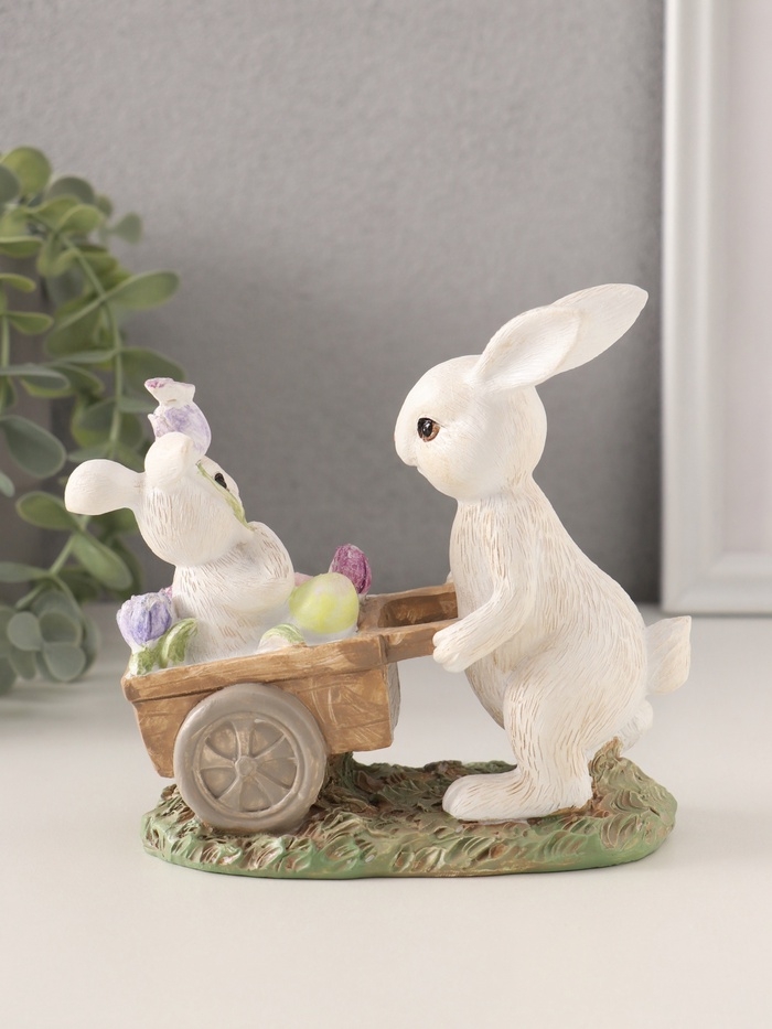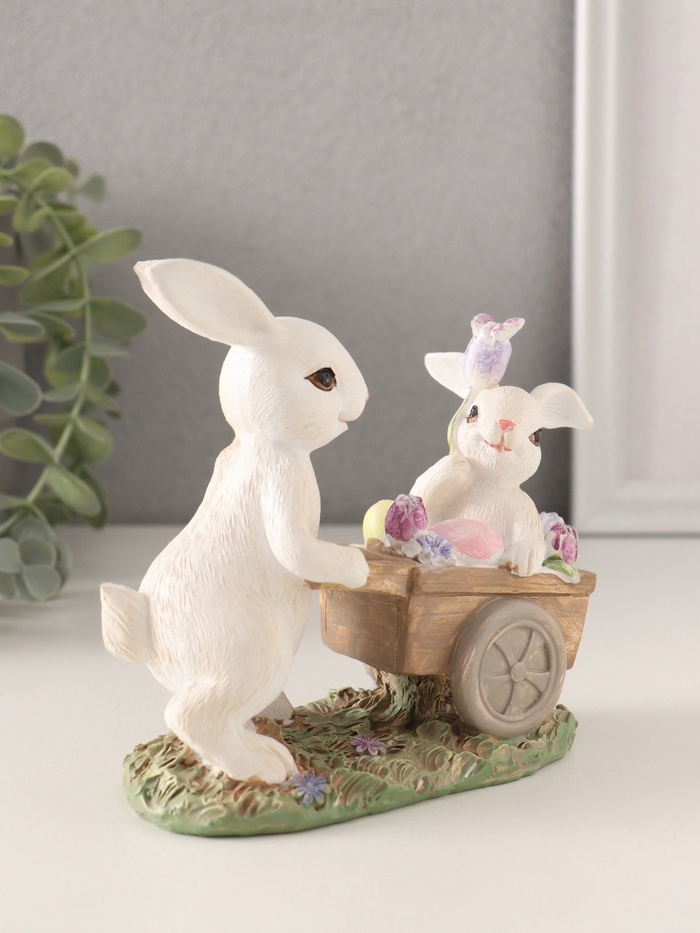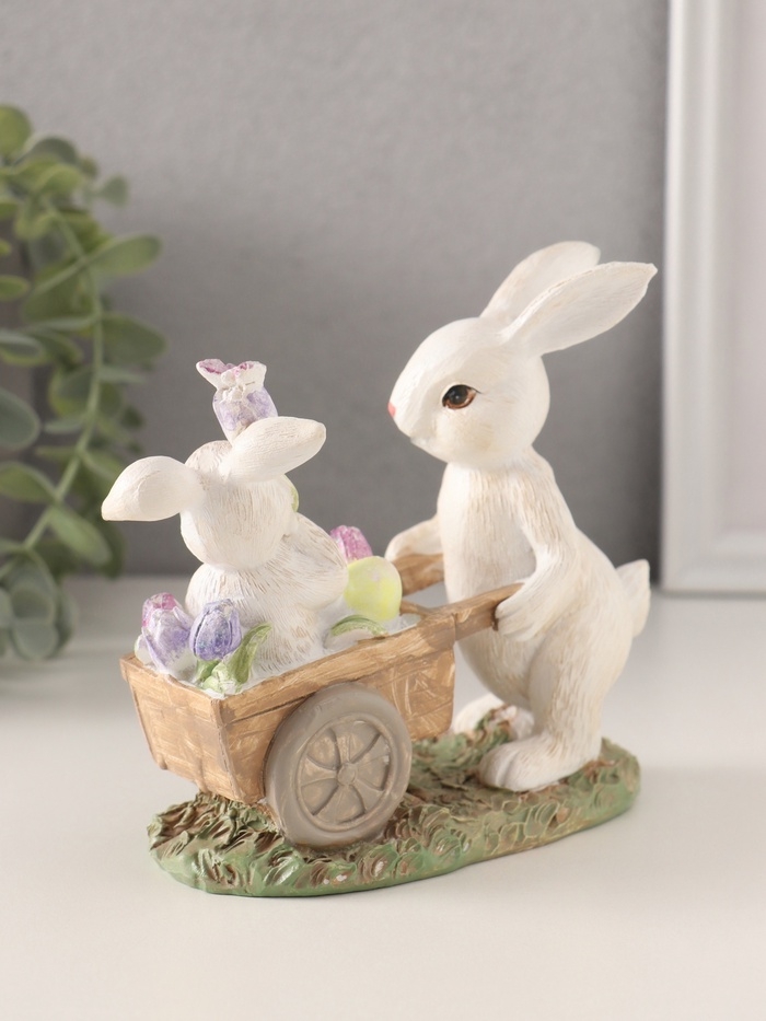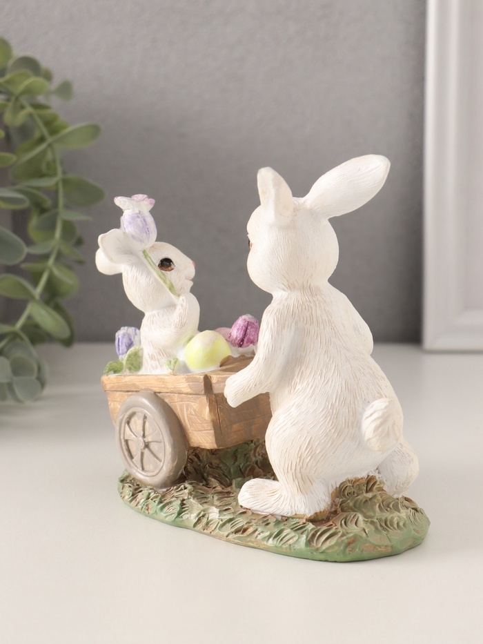 Сувенир полистоун "Кролик везет крольчонка в тележке с незабудками" 13,5х6,5х12 см