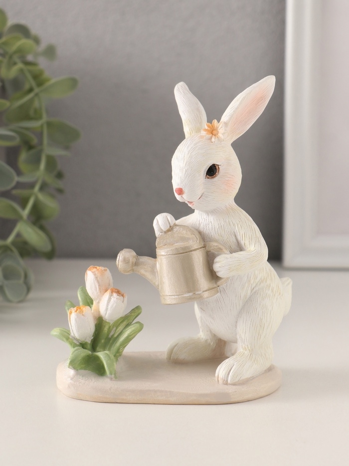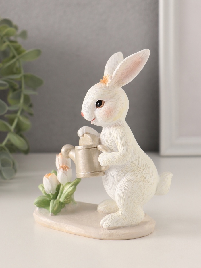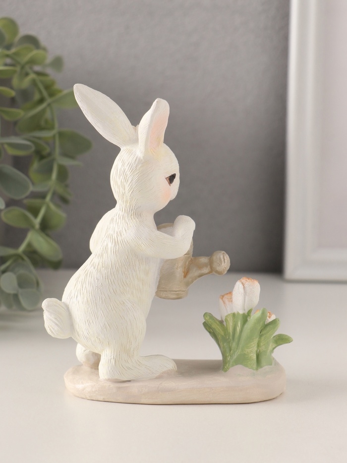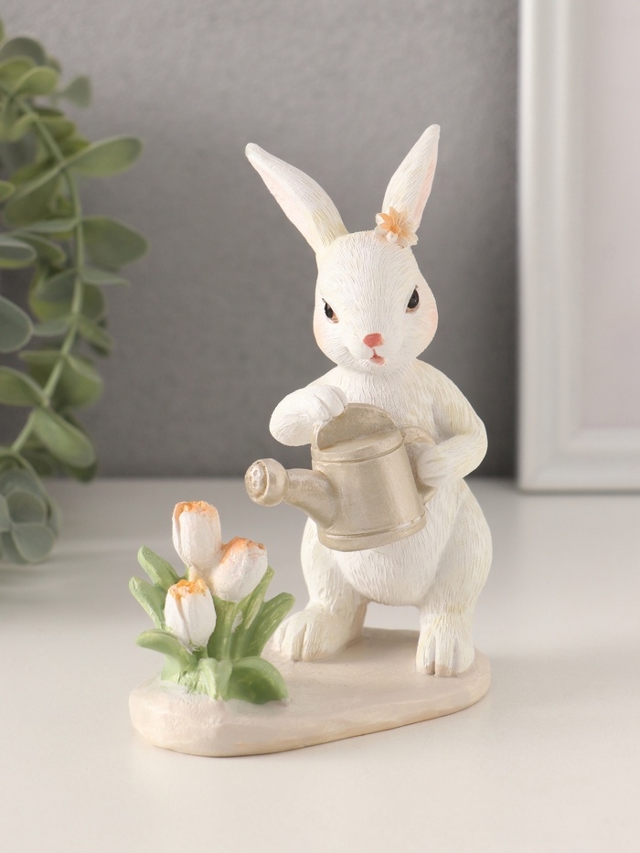 Сувенир полистоун "Зайка поливает тюльпаны из лейки" 10х5,5х12,5 см