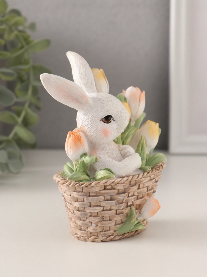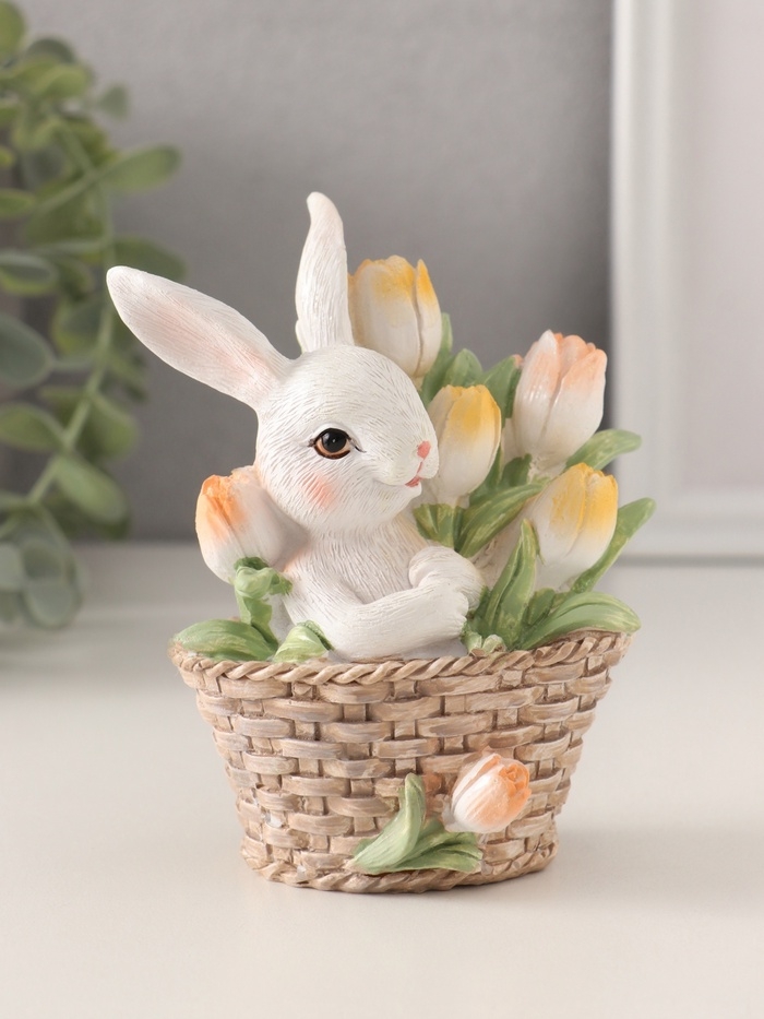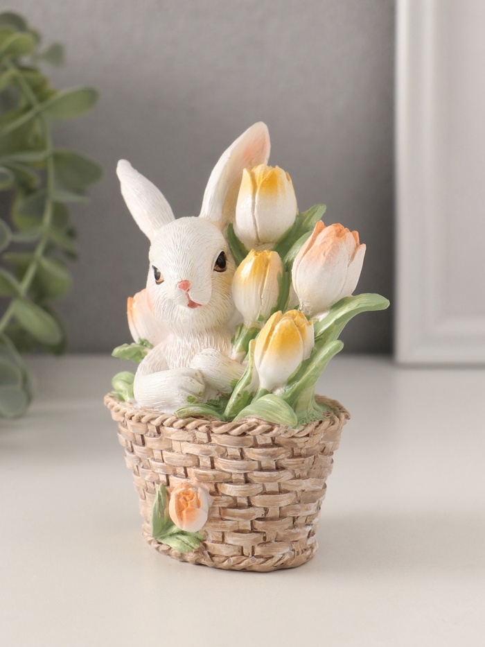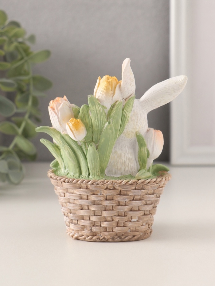 Сувенир полистоун "Белая зайка в плетённой корзине с тюльпанами" 9,5х5,5х11,5 см