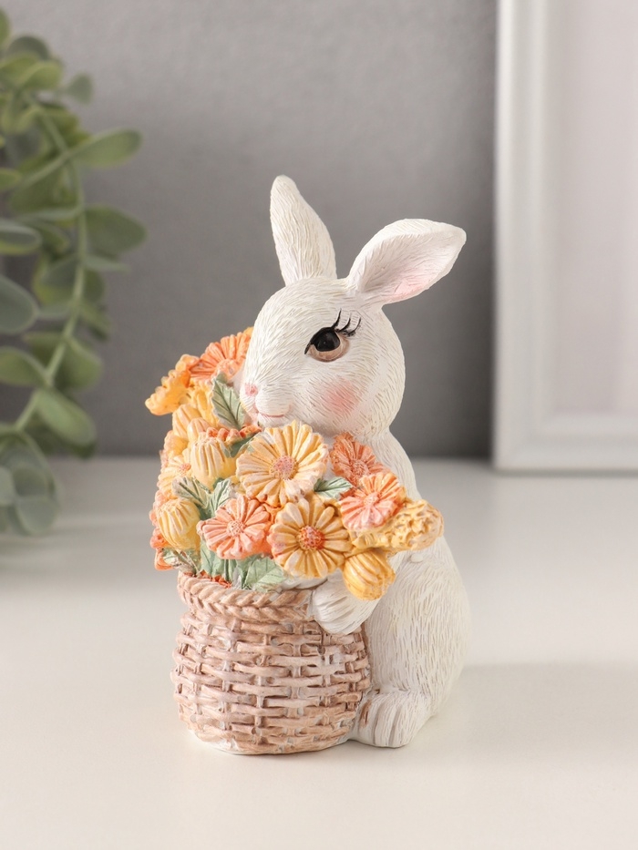 Сувенир полистоун "Белый кролик с цветами в плетённой корзине" 9х8,5х11,5 см